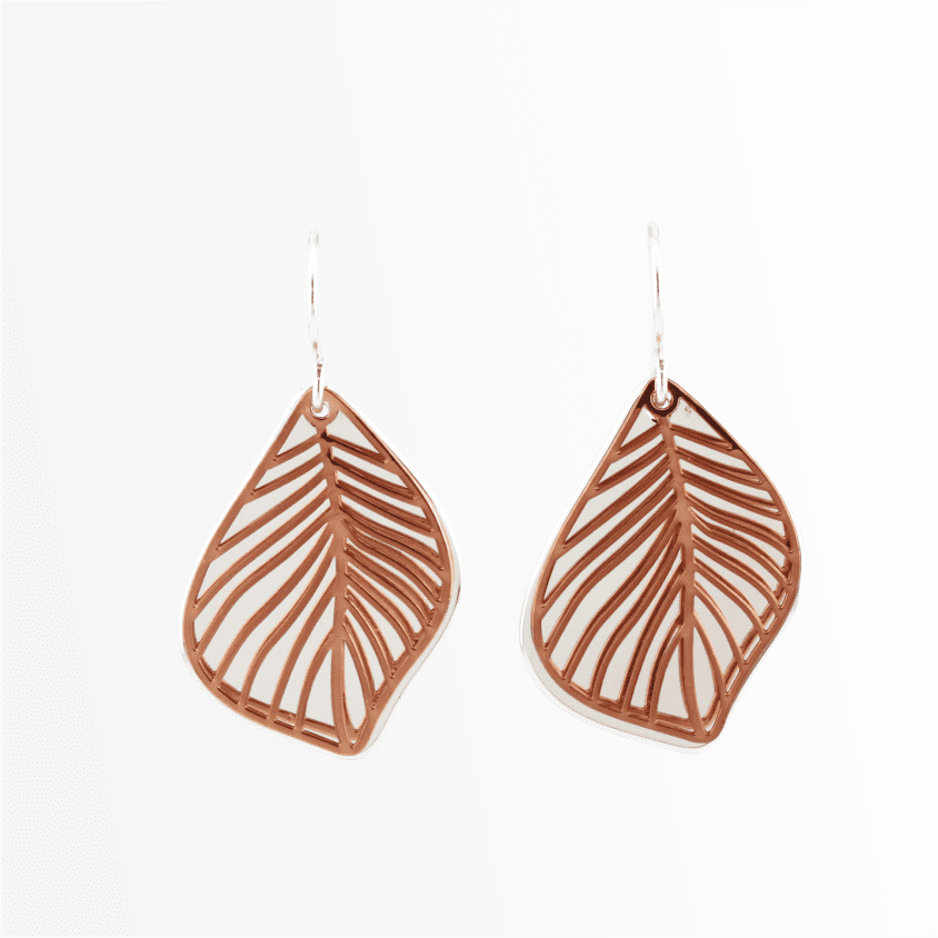 Silver earring with Gold or Rose gold filigree leaf feature. 4cm drop