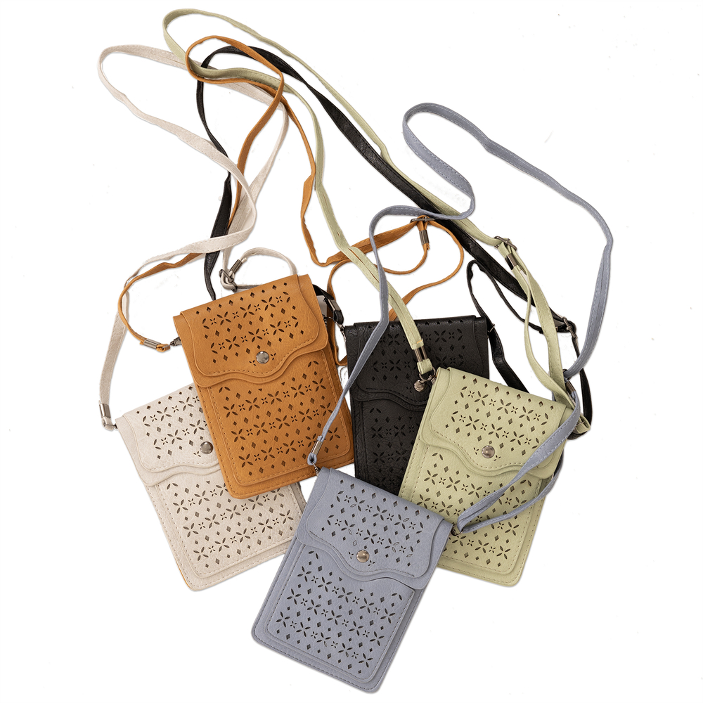 External Features: Laser cut front with front pocket. Cross Body strap with buckle extender. Magnetic snap under flap..