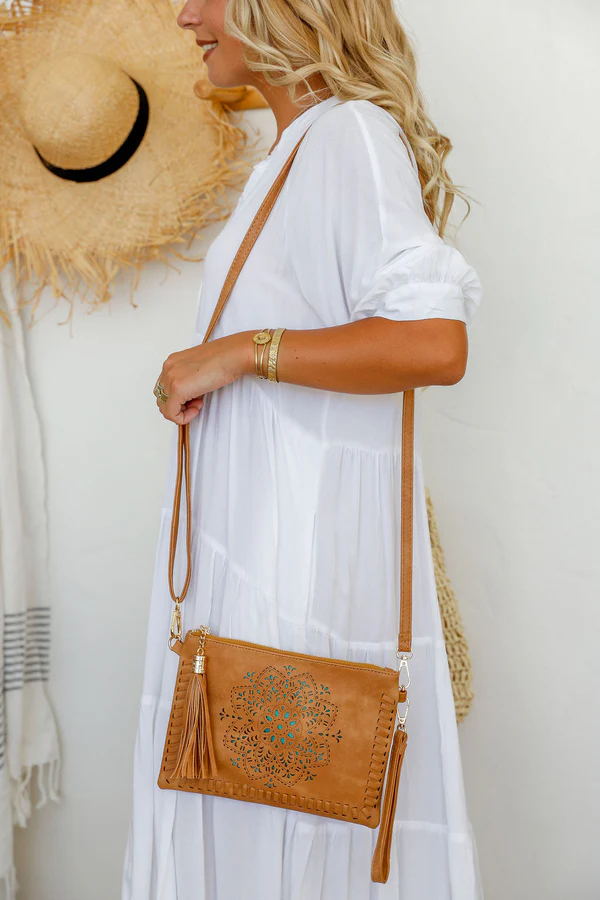 Beautiful faux leather bag with Mandala detail and tassel feature. Wrist strap plus shoulder strap included for over shoulder or clutch use.